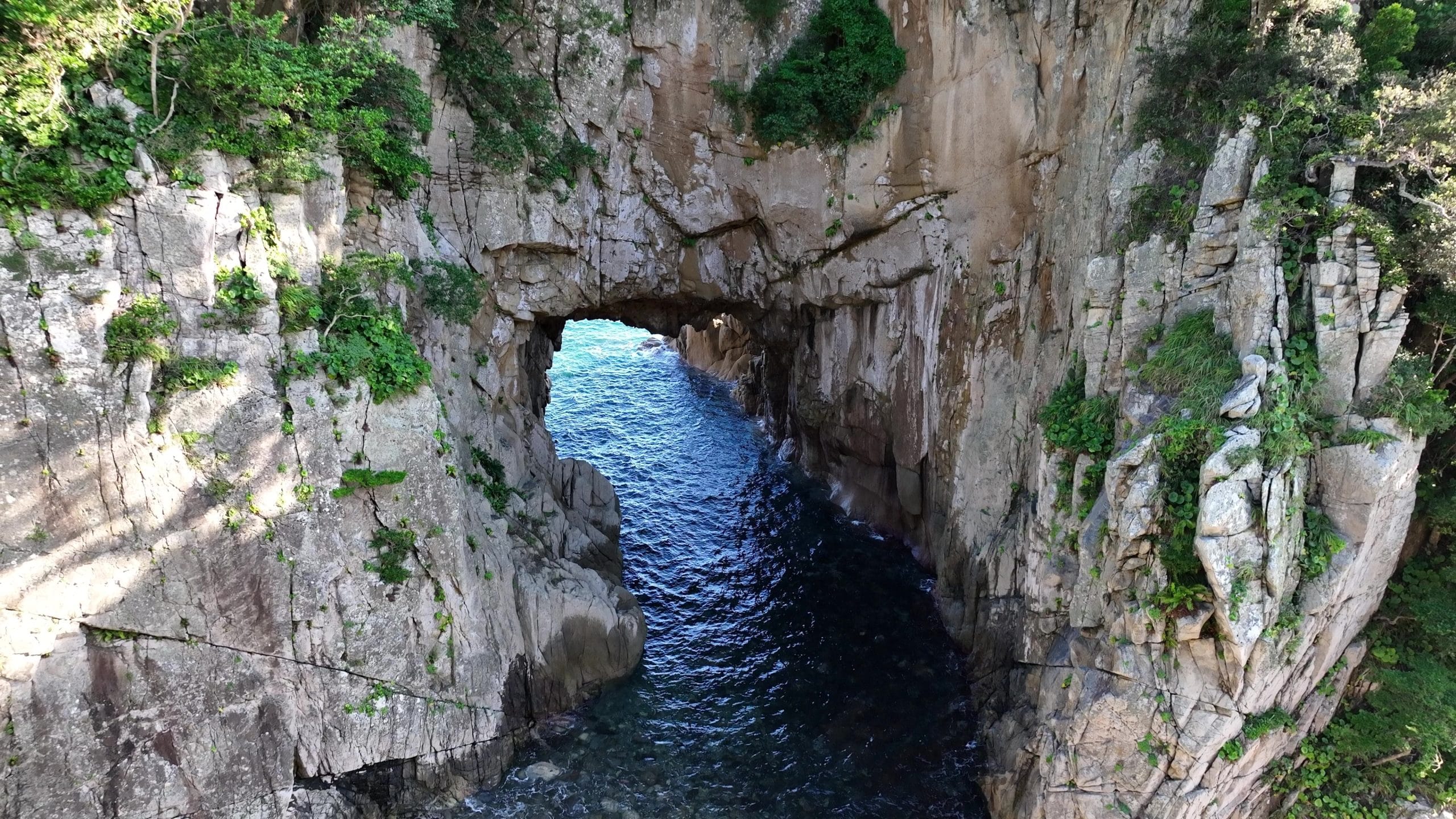 高知足摺岬~白山洞門 空撮 20240705 旅するドローン2024.10.032024年7月5日夕刻、太平洋を望む高知足摺岬、白山洞門付近で、DJI Mavic 3 による空撮。外洋に向かって正対する国内最大級の花崗岩海食洞「白山洞門」、永い年月をかけ、外洋の荒波が創りあげたその巨大洞門の存在感は圧倒的。その悠々しい光景に、人間の存在の儚さを感じ、また逆に勇気づけられます。